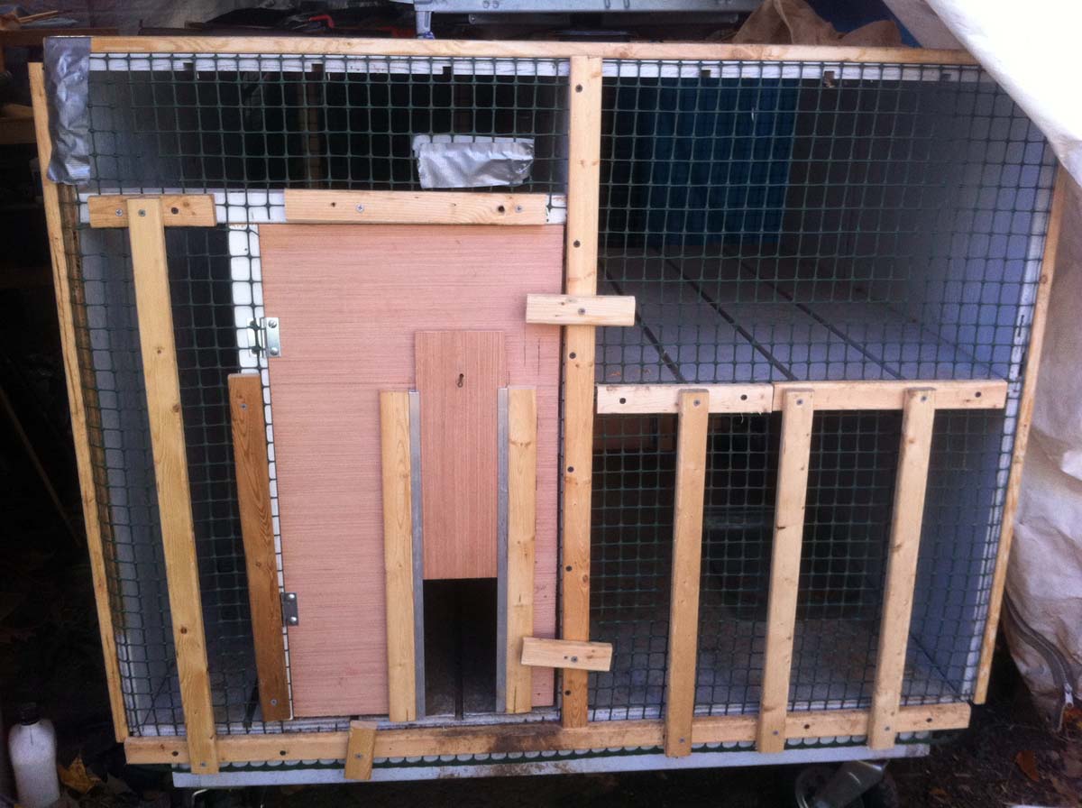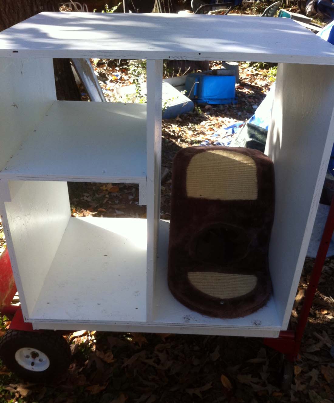| This cabinet was part of a work bench of which I redesigned. It's approximately 4' by 4' by 4'. Painted with latex primer and topcoat to keep cat tracking and litter box dirt from entering the wood. Also, 4 large 8" pneumatic casters were installed to make the cabinet easier to handle outside. | The front and back of the cabinet was covered with Plastic Garden Fence (Picture 6-Page 3) with 1" by 2" furring strips used to hold the fence in place. The primary purpose of this enclosure is to provide a safe place for the cats to eat. The secondary purpose is to trap feral cats that will not enter a wire trap. It provides a secure enclosure to keep the cats inside when used as a trap as well as protect them from dogs. The door on 2 hinges includes a vertical sliding trap door on 2 metal guides. | |||