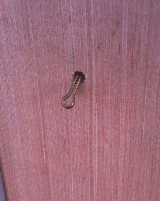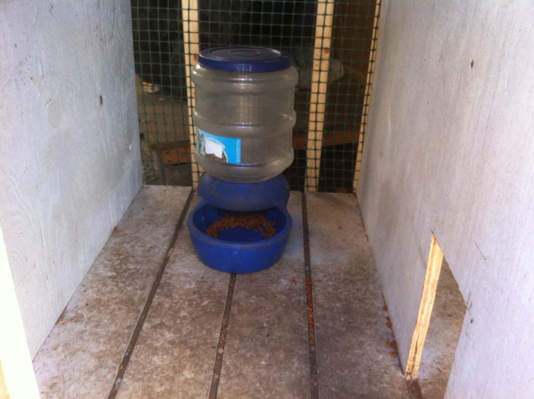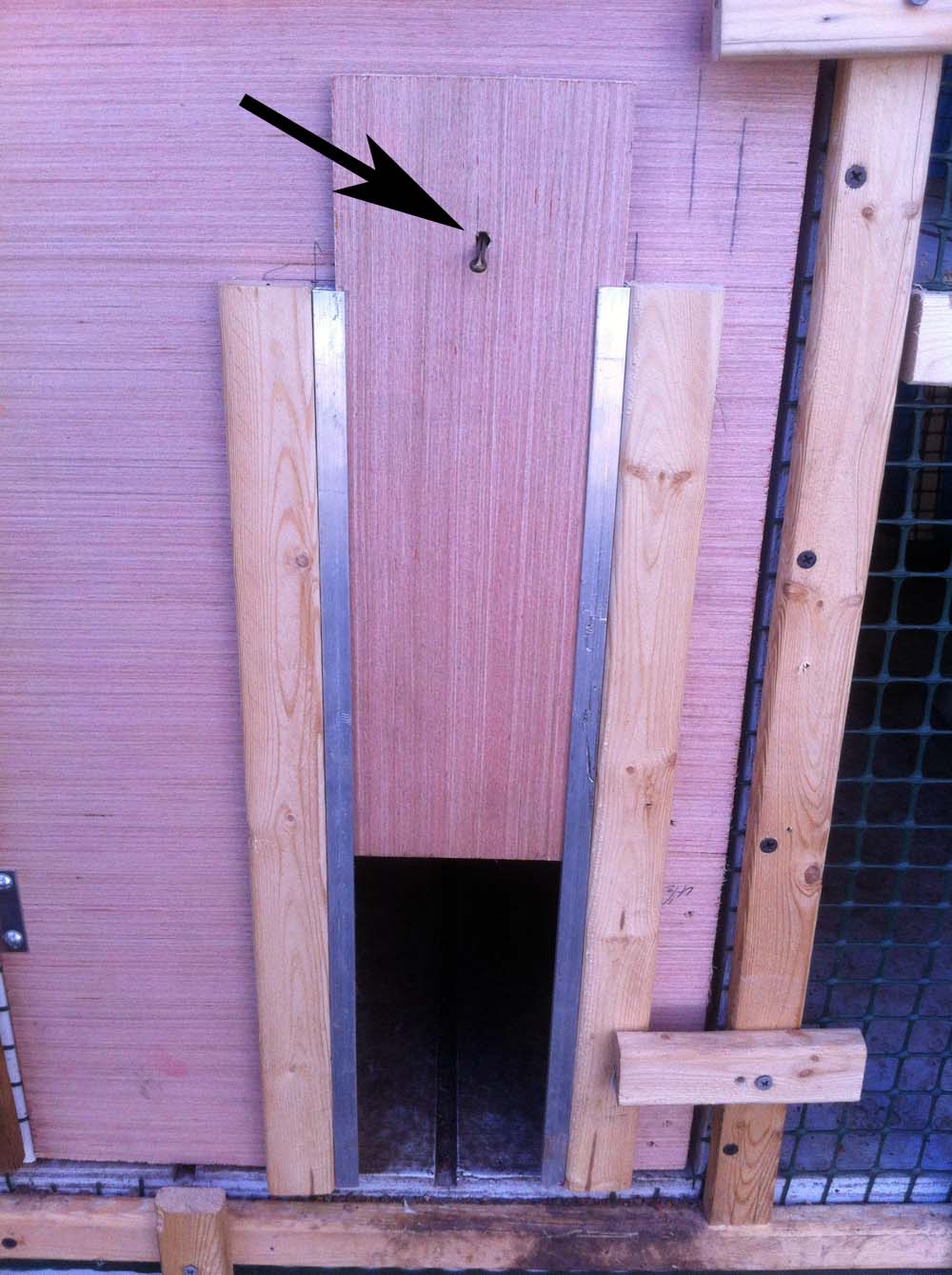 | Behind the door is a feeder. At the bottom right, also notice the small 'cat door opening' to the next room and another feeder location. The second room (Picture 5 on Page 3) is also the location of the rear trap door leading to the wire trap. | Front 'cat door' and trap. Cut from Luan plywood, the trap door is made within a larger door which gives access to filling the feeder. The small trap door is approximately 4" by 11" and slides on metal "U" shaped slides which are available from your hardware store. Notice the arrow. This is a cotter pin of which a commercial grade thread is attached. When the thread is pulled, the pin pulls out and the door falls and shuts. Make sure that when you construct this trap door, it falls just below the floor of the cabinet to give a tight seal. Hint: Make sure the edges of the trap door have been sanded and use wax or bar soap on the edges for a smooth action. Also, it's best to be out of sight when you pull the thread for the best chance of catching your cat. | |||